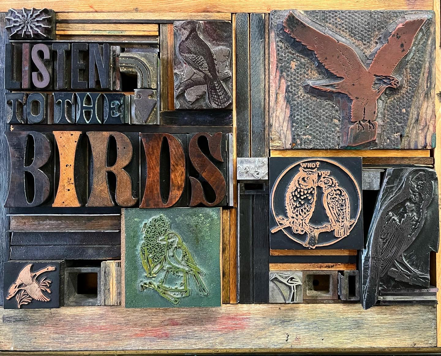 Made with antique image cuts, wood type and a lasercut wood background.